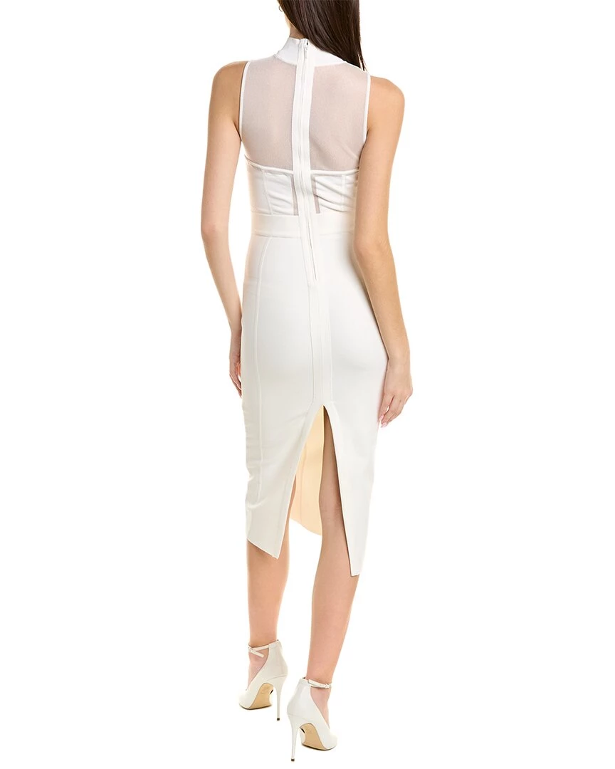 - Intarsia Bustier Midi Dress In White With Sheer Accents And Funnel Neck