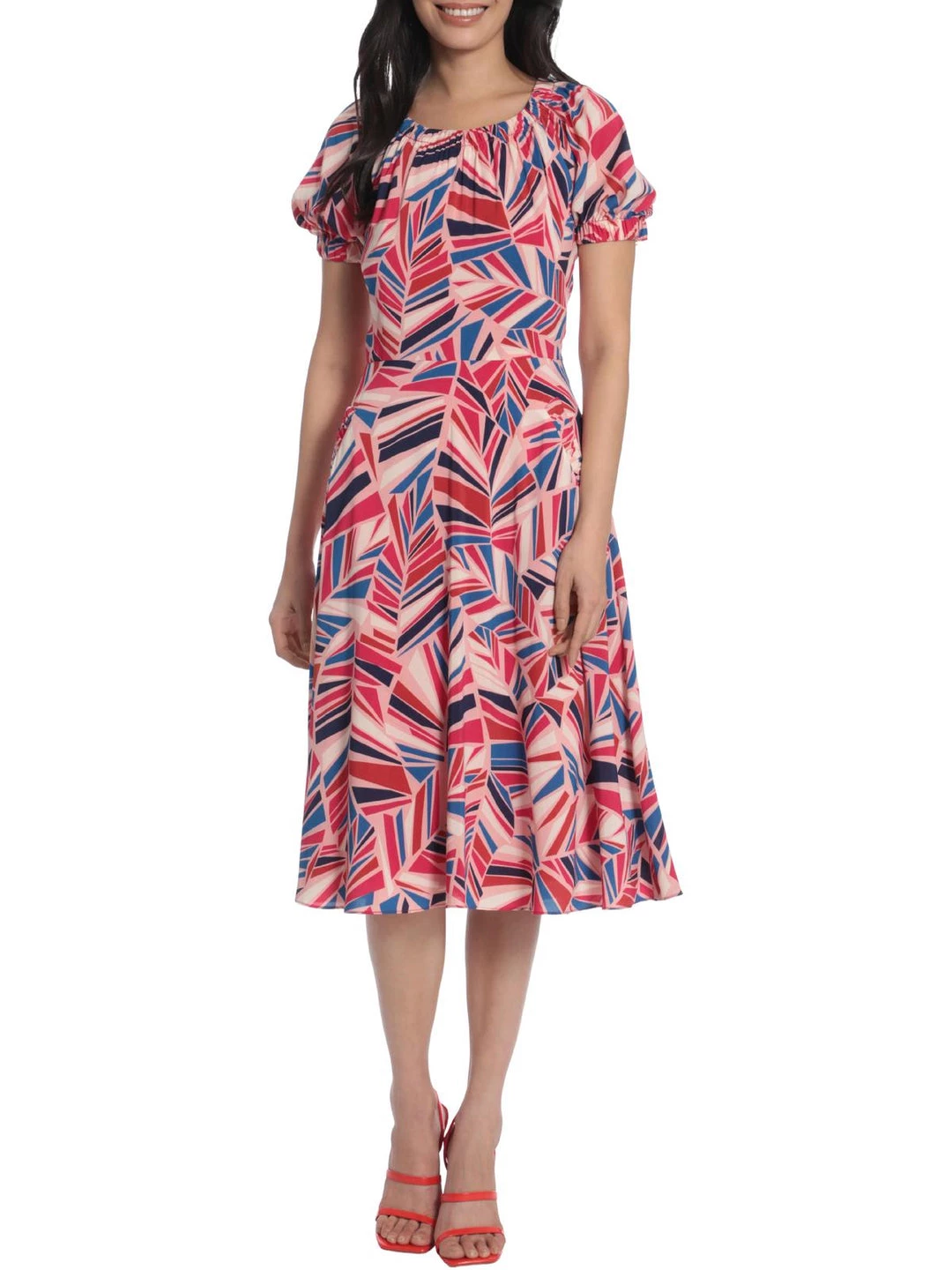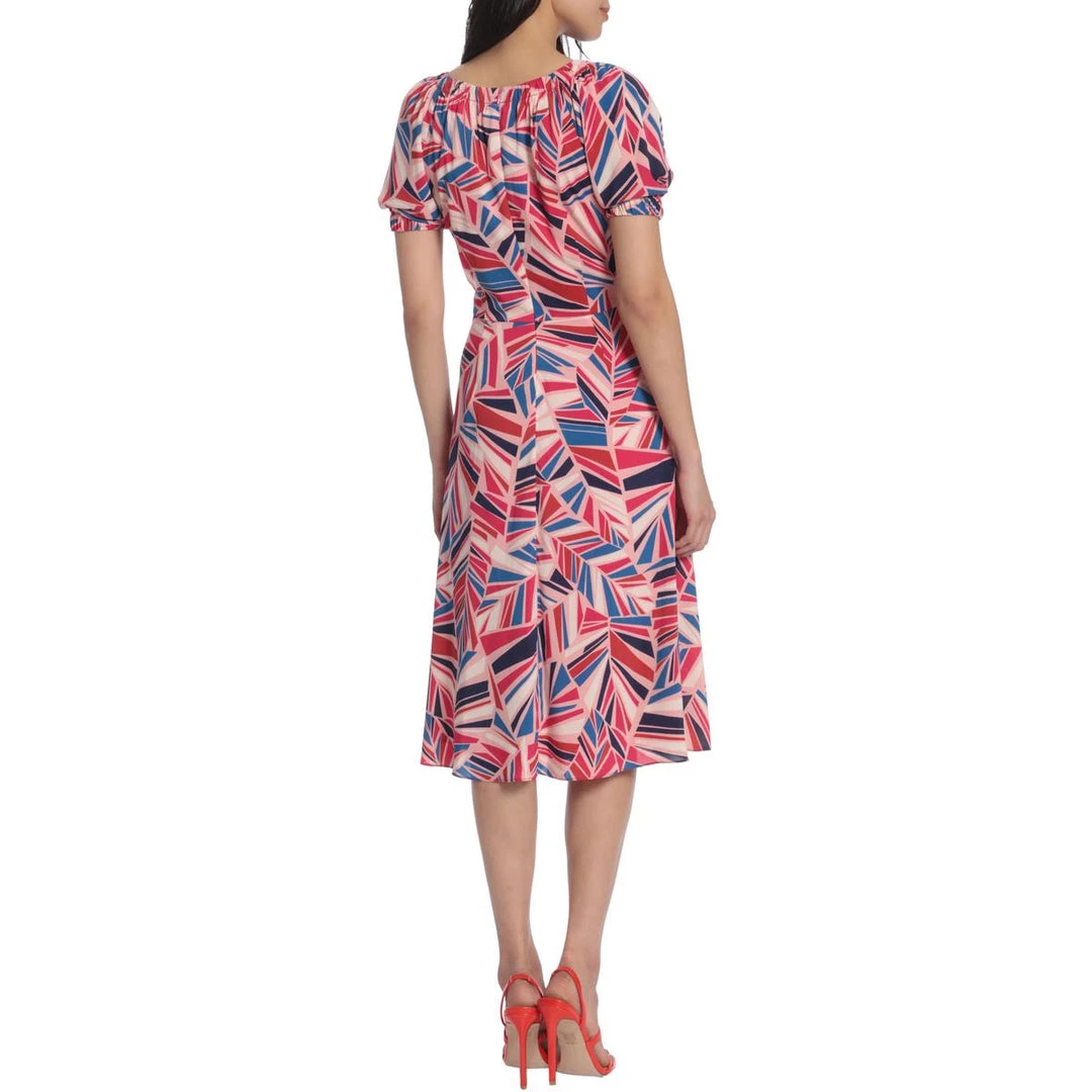 Fall in love with the Loralei printed flare dress by Maggy London. This dress is made of 95% polyester and 5% spandex. The bright geo print and flared silhouette offer eye catching feminine style. It features a gathered neckline with short elastic cuff sleeves and a hidden back zip closure.