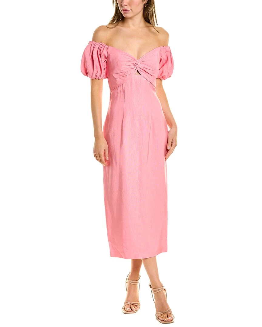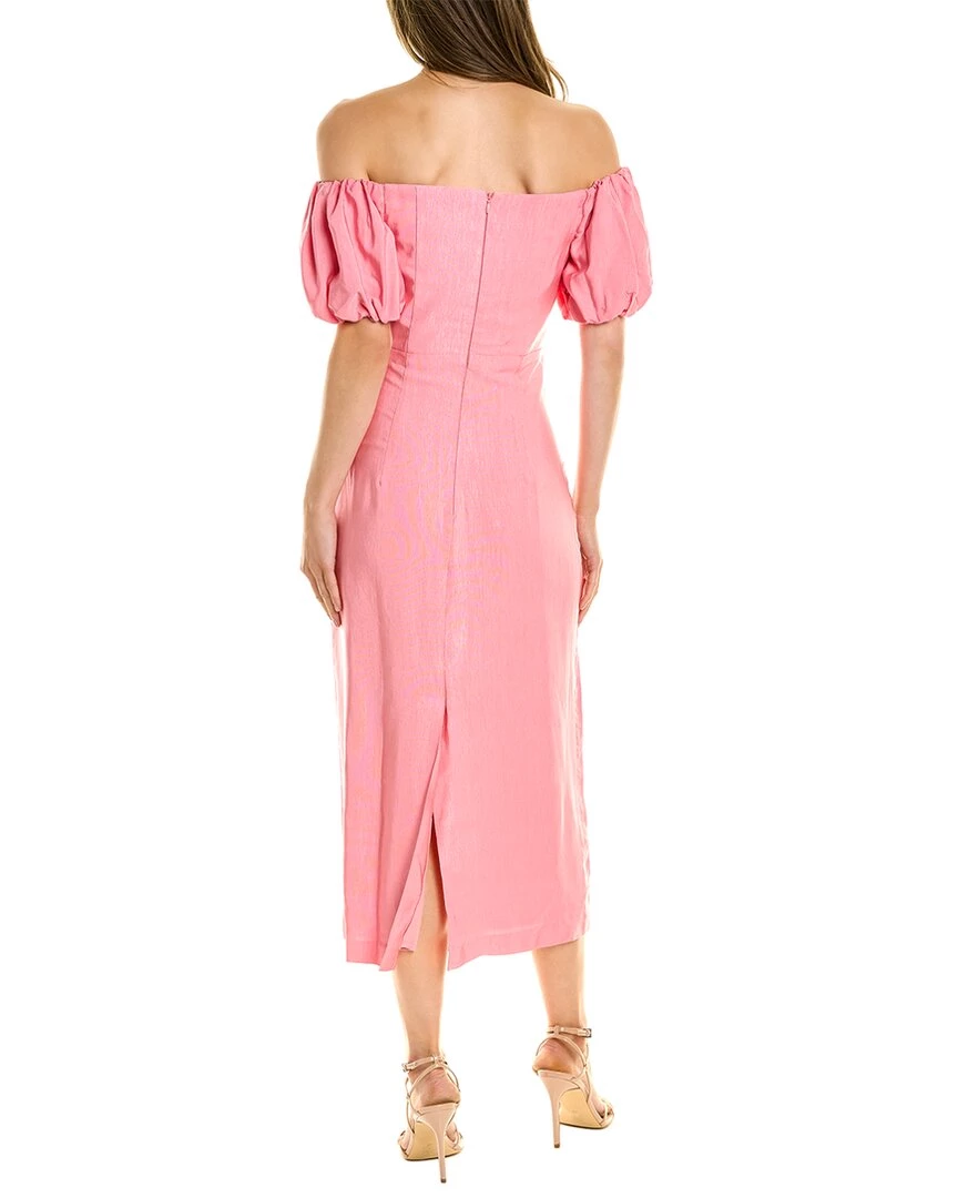 - Off-Shoulder Midi Dress In Pink With Puff Sleeves, Bodycon Silhouette, And Twist Top Detail