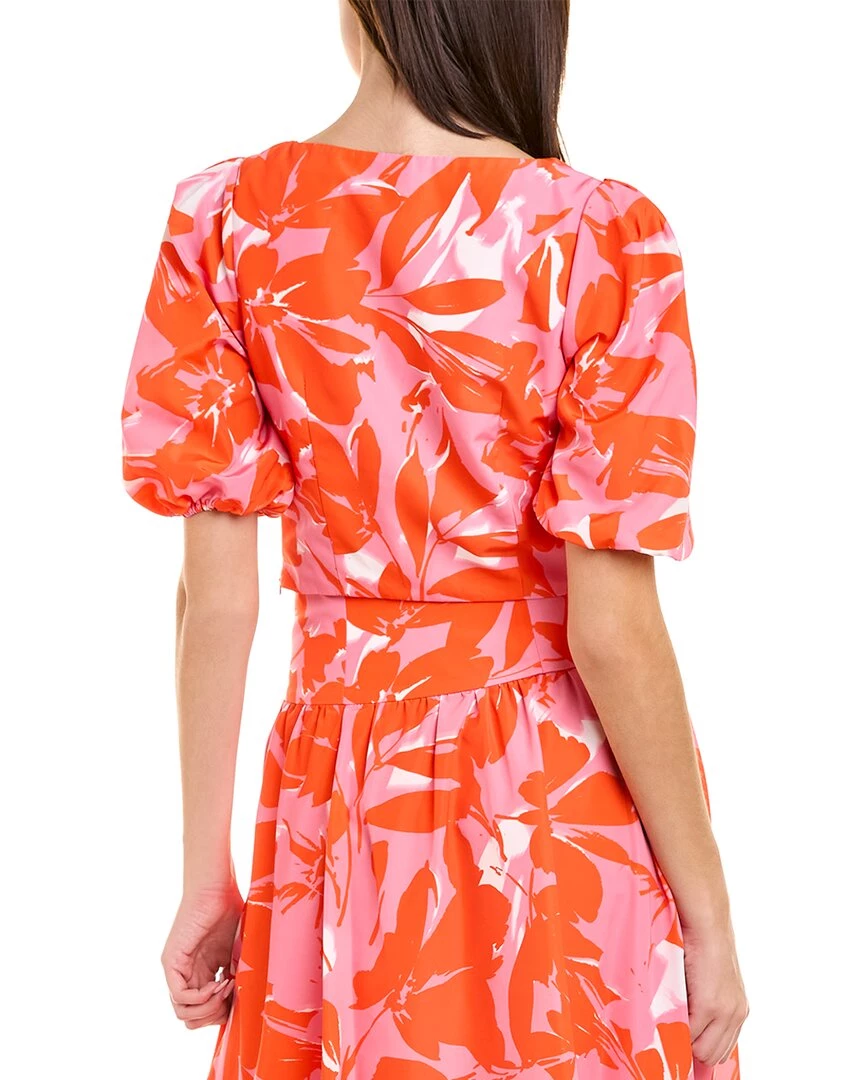 - Taffeta Top In Dancing With Short Puff Sleeves, Twisted Front, And Plunging Neckline